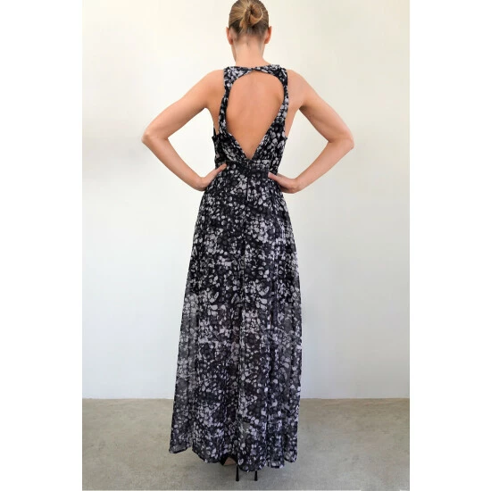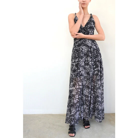 The Diamond Maxi dress is a chic option for this summer’s endless occasions. This elegant dress comes with a fitted body part with twisted strap details, an open back and a floaty skirt with slits to show a bit of leg. It is offered in a selection of our in house hand-painted Floral, Animal and Abstract prints. Printed on sheer georgette fabric with a short lining this keeps the dress floaty, light and airy. Perfect for any event. This SS22 we introduce our new kinder georgette made from 55% recycled polyester. The model wears a size S equivalent to a UK size 10, the top part is fitted and the skirt part is looser.