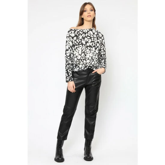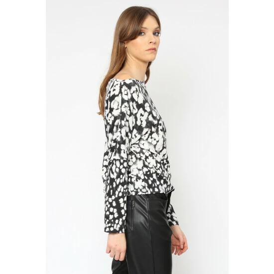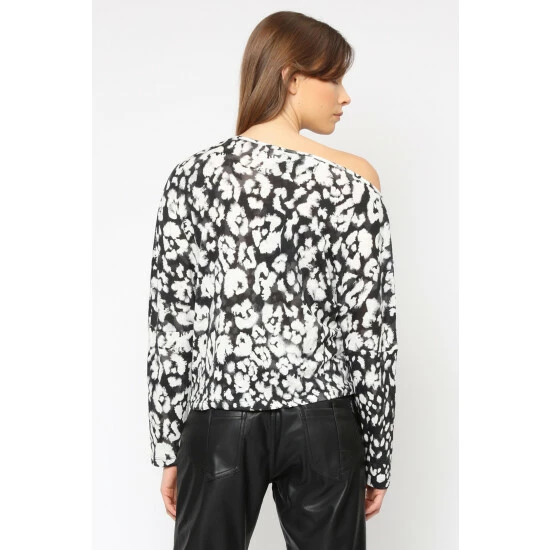 The Cosmic top in our hand painted black and white Temptation animal print is great for a polished look that works both in the office and for the evening. This off the shoulder top is made in a textured cotton jersey for ease and comfort and features long sleeves and a slim fit. Dress up with a skirt or down with a pair of jeans or leather look trouser and ankle boots. The model wears a size 10. Made out of 100% natural fibres.