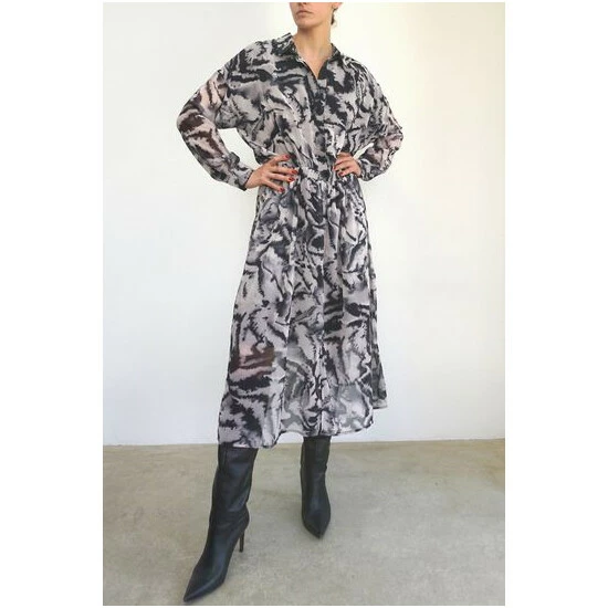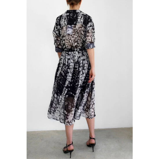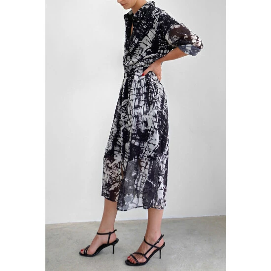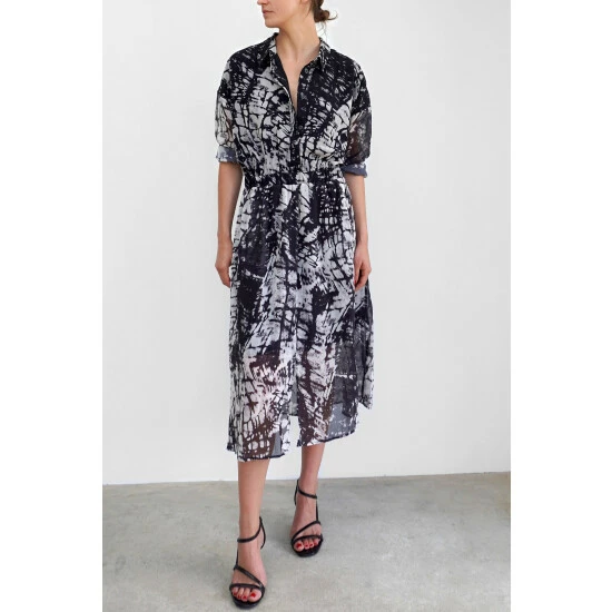 The Cosmic day dress offers a chic take on a wardrobe classic. Crafted in a selection of our hand painted abstract and animal prints. This style features a classic collar and a button placket with an elasticated waist for ease and comfort. This great day to night dress has pockets of course. Wear with knee high boots or strappy heels for a day to evening look. This style is made with 50% recycled fabric made from plastic bottles.. This style has a relaxed fit, the model wears a size 10.
