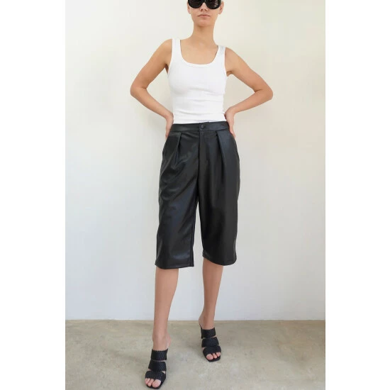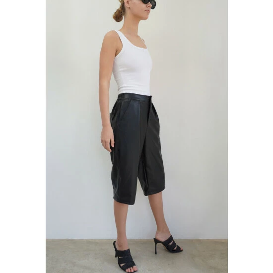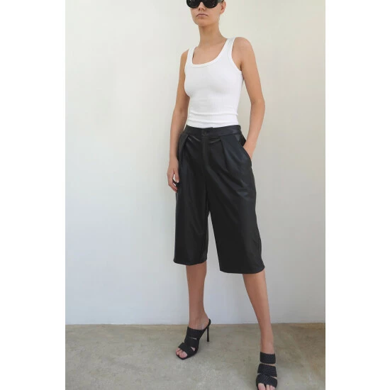 The System Faux leather city shorts are a great wardrobe update, moving the winters trends into summer. The wide leg shorts are made from our soft Faux leather quality, which washes and wears season after season. They have a regular fly front with a flat waist band front and an elasticated waist at the back for easy comfort. The on brand asymmetric back pockets gives a great twist to the classic shape. They have deep pockets and the length is just above the knee. The shorts look great from desk to dinner and dressed up with a feminine heels and a printed top. The model wears a size S equivalent to a UK size 10, so go down a size if you are looking for a more petite fit.
