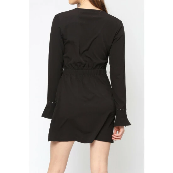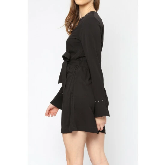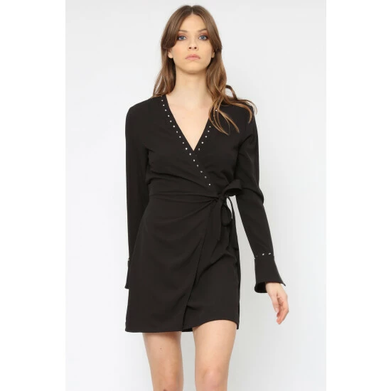 Channel relaxed cool femininity in this Little Black Dress made in textured crepe. The Refine dress in black features a faux wrap front with belted waist, slim sleeves with a slight flute at the cuff and stud detailing and neckline. With an elasticated back waist for easy styling and comfort this will be your go to LBD. A flattering short dress for any occasion. The model wears a size 10 and is true to UK sizing.