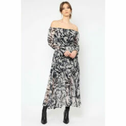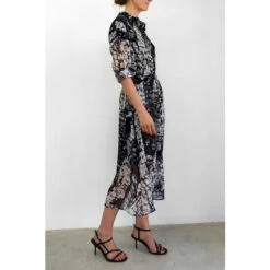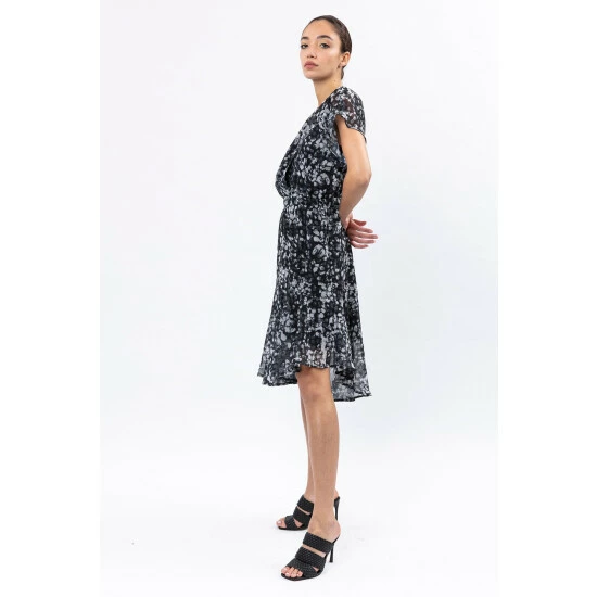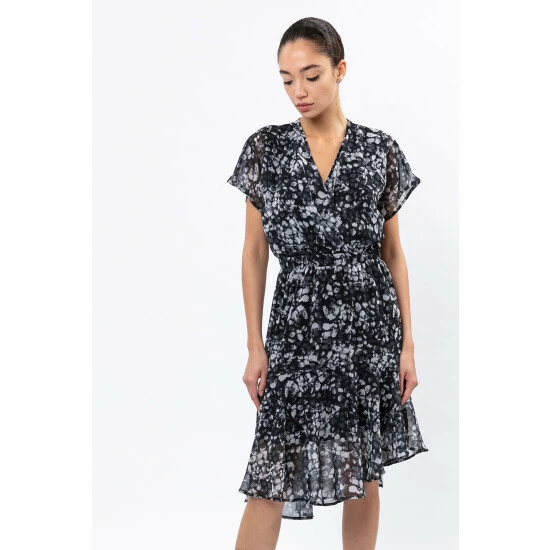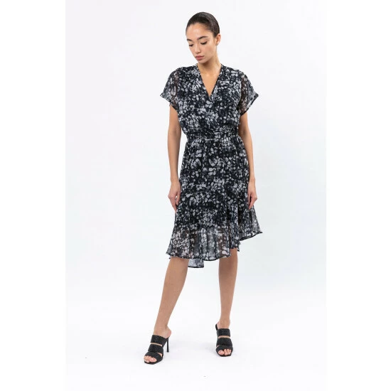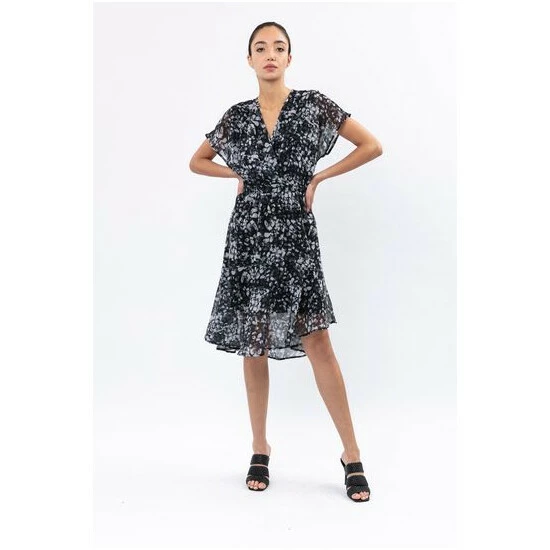 The Channel dress is available in a selection of our in house hand-painted Floral, Animal and Abstract prints it is an elegant shape that will translate well from day to evening, season after season. This short – just above the knee length style comes with an A-symmetric floaty hem, elasticated waist for flattering an easy styling, capped short sleeves and a fake wrap front that attaches to the waist. Wear it with ankle boots and our biker jackets or on its own with sandals or strappy heals. This SS22 we introduce our new kinder georgette made from 55% recycled polyester. The model wears a size S equivalent to a UK size 10, so go down a size if you are looking for a more petite fit, the waits is fitted, the top and skirt part is looser.