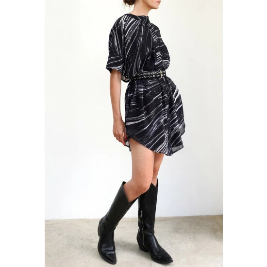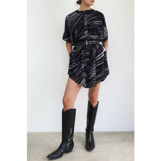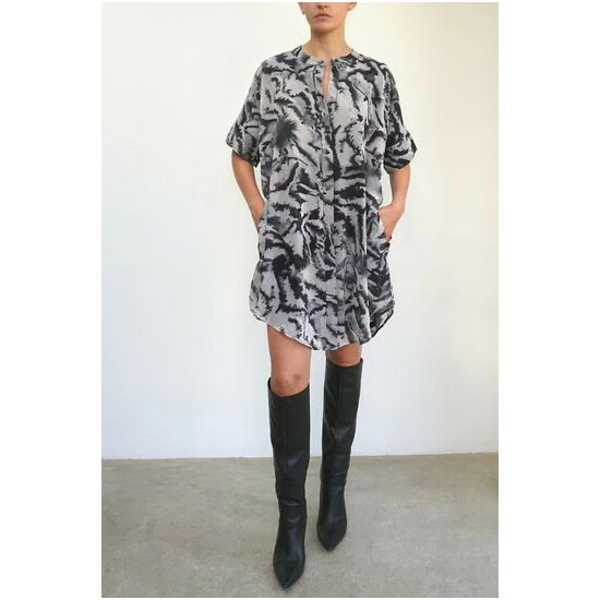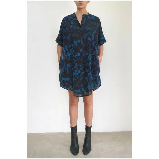 A Religion classic, The Cosmic tunic is as easy as it s versatile. This oversized tunic dress is available in a selection of our hand painted abstract, floral and animal prints featuring a grandad collar, short sleeves, boxy shape, side seam hidden pockets and a button through placket. The Tunic looks great worn as a dress with or without a belt or worn open as a layering piece with jeans and a top. Please go down 1 size if you want it less oversized. This style is made with 50% recycled polyester georgette fabric made from plastic bottles. This style has an oversized fit, the model wears a size 10.