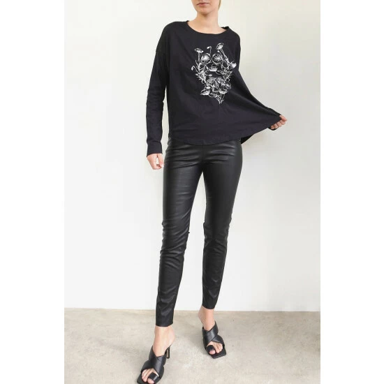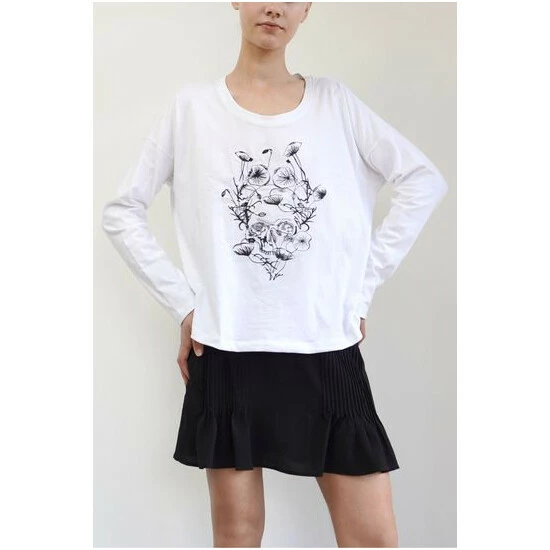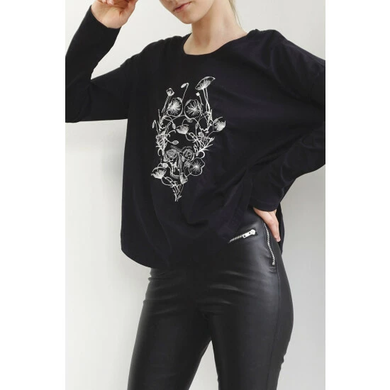 The long sleeve Constant top is made in our soft cotton jersey and is available in a selection of solid colours and features a crew neckline with a curved hem and an oversized body fit. It has a beautiful embroidered skull surrounded by flowers in contrast stitch. Please go down 1 size if you prefer it less oversized. Model is wearing a size UK 10. Made of 100% natural fibres.