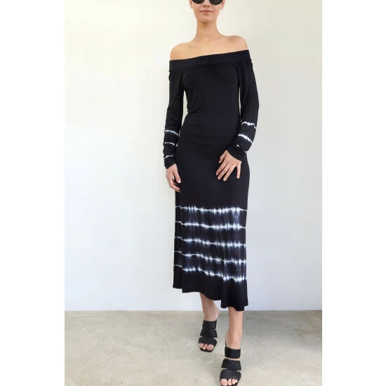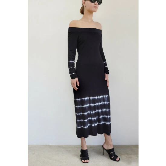 The Modern off the shoulder jersey dress is the perfect desk to dinner piece for summer. Its an online exclusive merging the brands signature hand done tie dyes with a best-selling shape. The dress is body skimming made from slinky loose viscose jersey, it has a straight neck line and log slim fitting sleeves with a wider skirt part that finishes mid calf. The placement tie dye stripe is done individually by hand, so each peace is slightly different. The model wears a size S equivalent to a UK size 10, so go down a size if you are looking for a tighter fit, although the material of this will stretch over time with wear and it has been designed to be body skimming. After wash the shape will shrink back to shape.