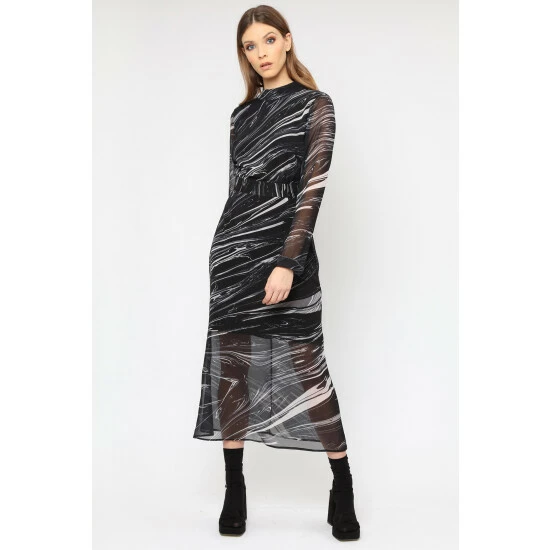 A Brand show stopper, The Dazzle dress will make a chic addition to any wardrobe available in a selection of our hand painted abstract, floral and animal prints. The open-back silhouette adds a dramatic touch for a wedding or special occasion. This easy fit slim line dress features a mid calf length, long chic sleeves, elasticated back waist to ensure it fits just right, high neck and a bow tie back just below the exposed low back. The perfect addition to any occasion wear wardrobe, although can be layered too with a cami or a blazer on top for a more day to night attire. This style is made from 50% recycled georgette fabric made from plastic bottles and the body is fully lined. This style has a regular fit, the model wears a size 10.