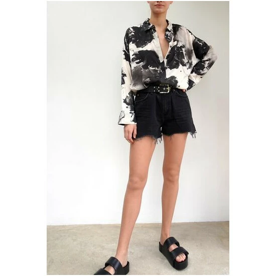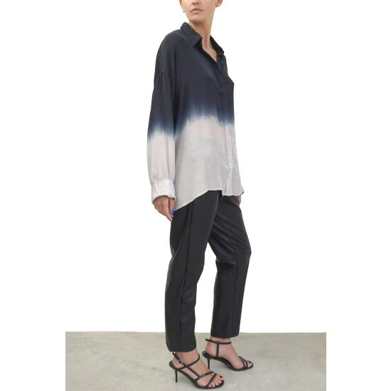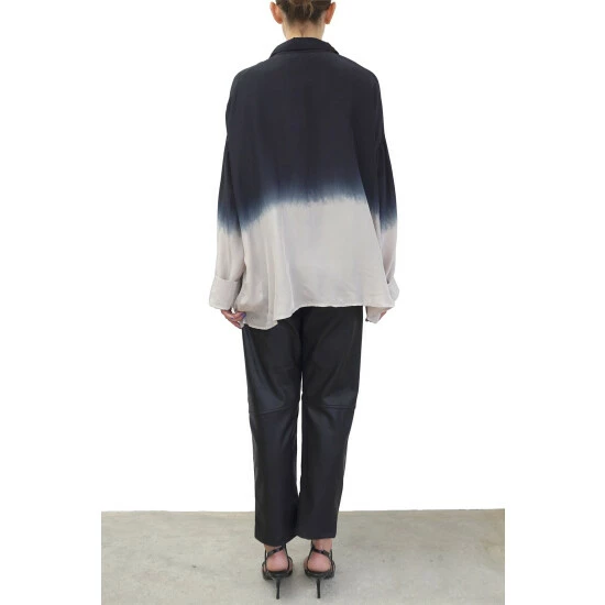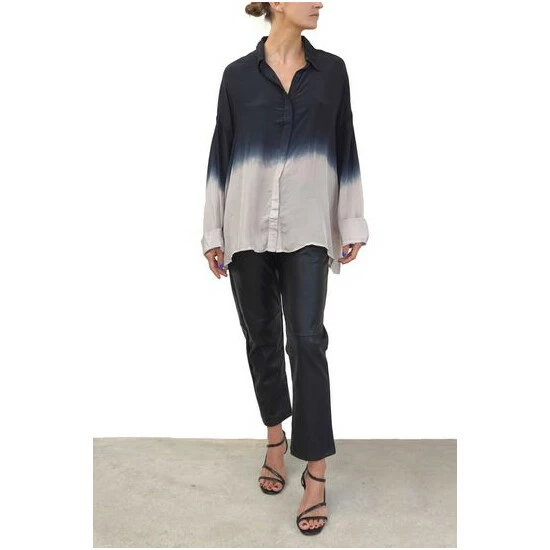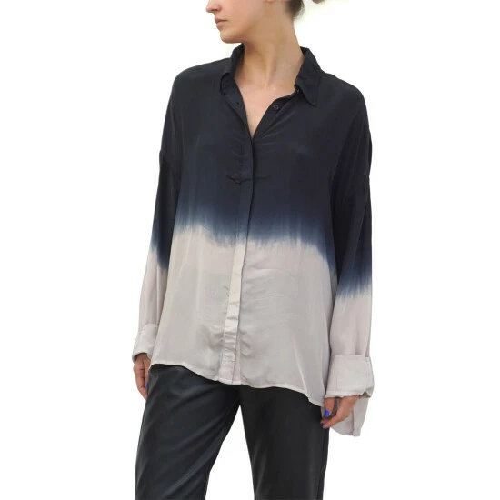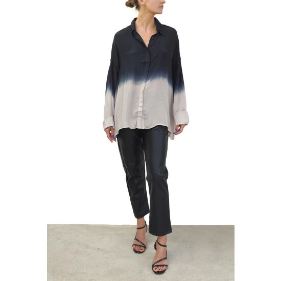 This Oversized boxy Jade shirt is a best-selling shape for the brand. This season’s update has a wider loose sleeve and is made from our vegan silk; bear in mind this luxurious fabric does need a quick steam or light iron to look and feel its best This style features a classic collar shape with a button through hidden placket and is offered in a selection of tie dyes and hand painted florals. The tunic shirt shape is hip length and has a very oversized fit, the model wears a size S equivalent to a UK size 10, please go down 1 size if you like it to be less oversized although it will not be fitted.
