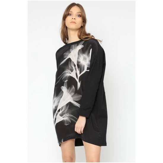 A contemporary take on luxurious leisurewear, The Strike dress is a stylish yet comfortable piece. Crafted from a silky woven fabric on the front with a selection of bold placement prints and with cotton sweat sleeves and back panel. This short tunic dress features a crew neck, long sleeves and has a relaxed straight body fit. Wear as a dress or layered over leggings as a tunic. The front fabrics needs a gentle iron or steam when it comes straight out of the package to remove excess creasing from shipping. This style comes in a selection of prints. The model is wearing a size 10, go down one size if you want less loose styling.