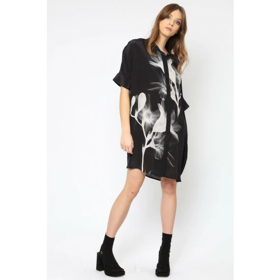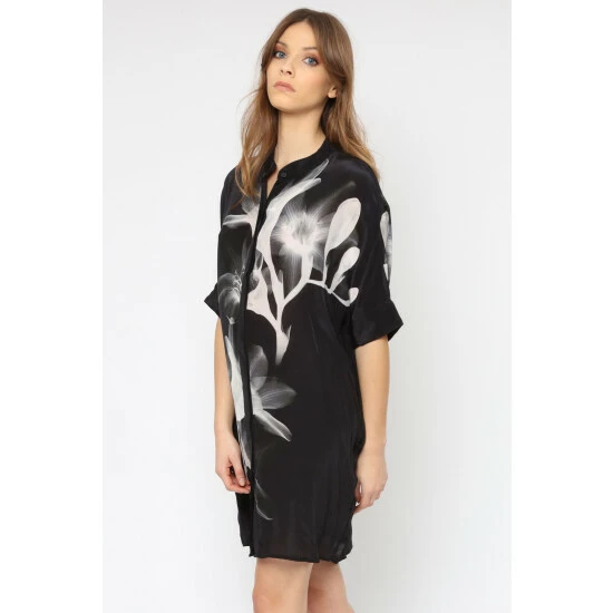 The strike tunic is our bestselling shape season after season and we have updated it this season with new beautiful hand-painted prints. Made from our gorgeous cupro which is known as a vegan silk, this short tunic dress has a grandad collar, short shirt sleeves and a button through placket so it can be worn as a dress or open as a layering piece. The Tunic comes in several print options. This is an oversized style, please go down 1 size if you like it less oversized. This fabrics needs a gentle iron when it comes straight out of the package to remove excess creasing from shipping. The model is wearing a size 10.