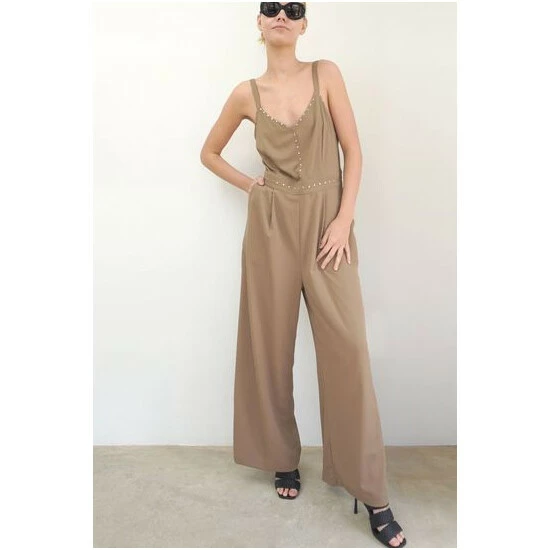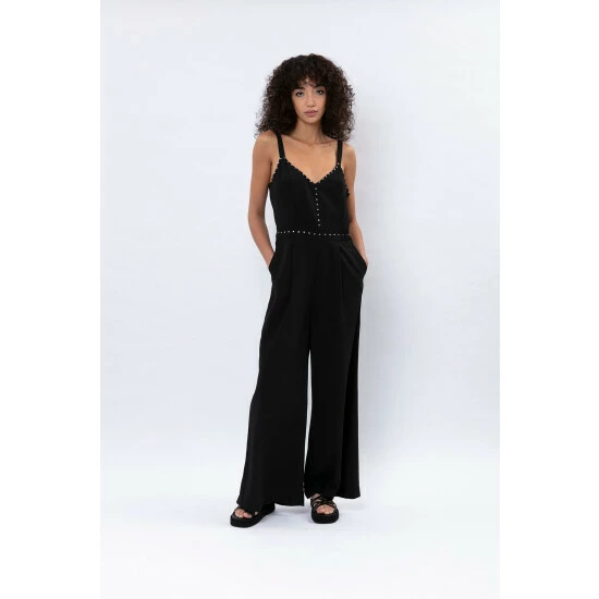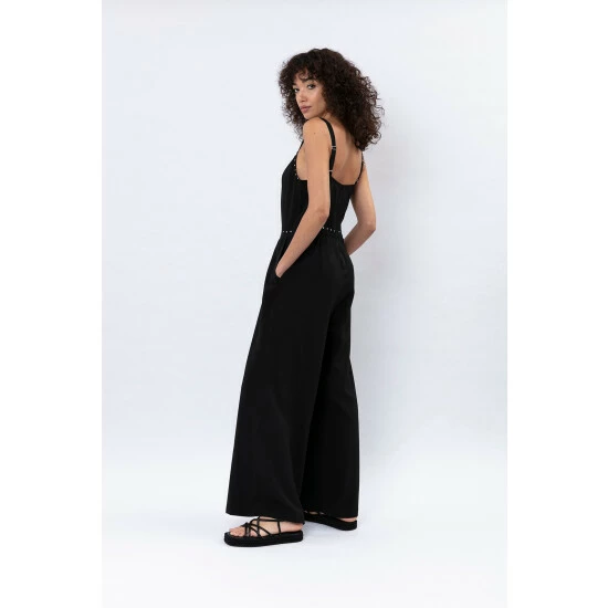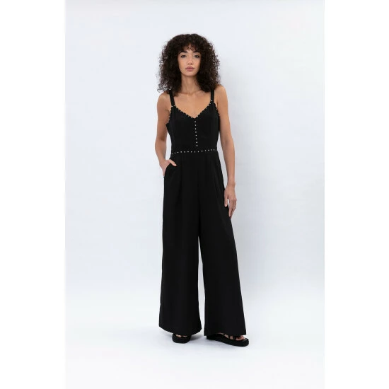 The wide leg strappy Moissanite jumpsuit in soft textured crepe is available in a selection of block colours. This style has a fitted bodice, wide leg, adjustable straps and stud detailing to give it that Rock N Roll edge. Perfect for day-to-night and great on its own or worn as a pinafore. The model wears a size S equivalent to a UK size 10, the fabric is not stretchy with a more fitted top half and looser trouser part, please consider when choosing your size. Adjust the straps before trying this.